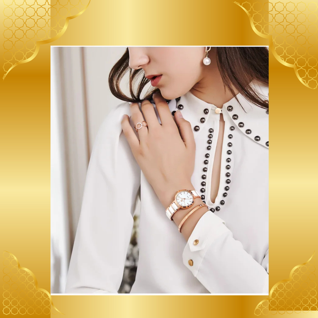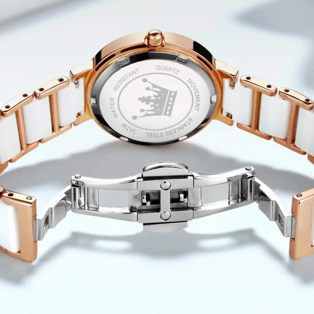 ✔ Materiais Premium – Pulseira em cerâmica simulada com aço inoxidável resistente, trazendo conforto e durabilidade.